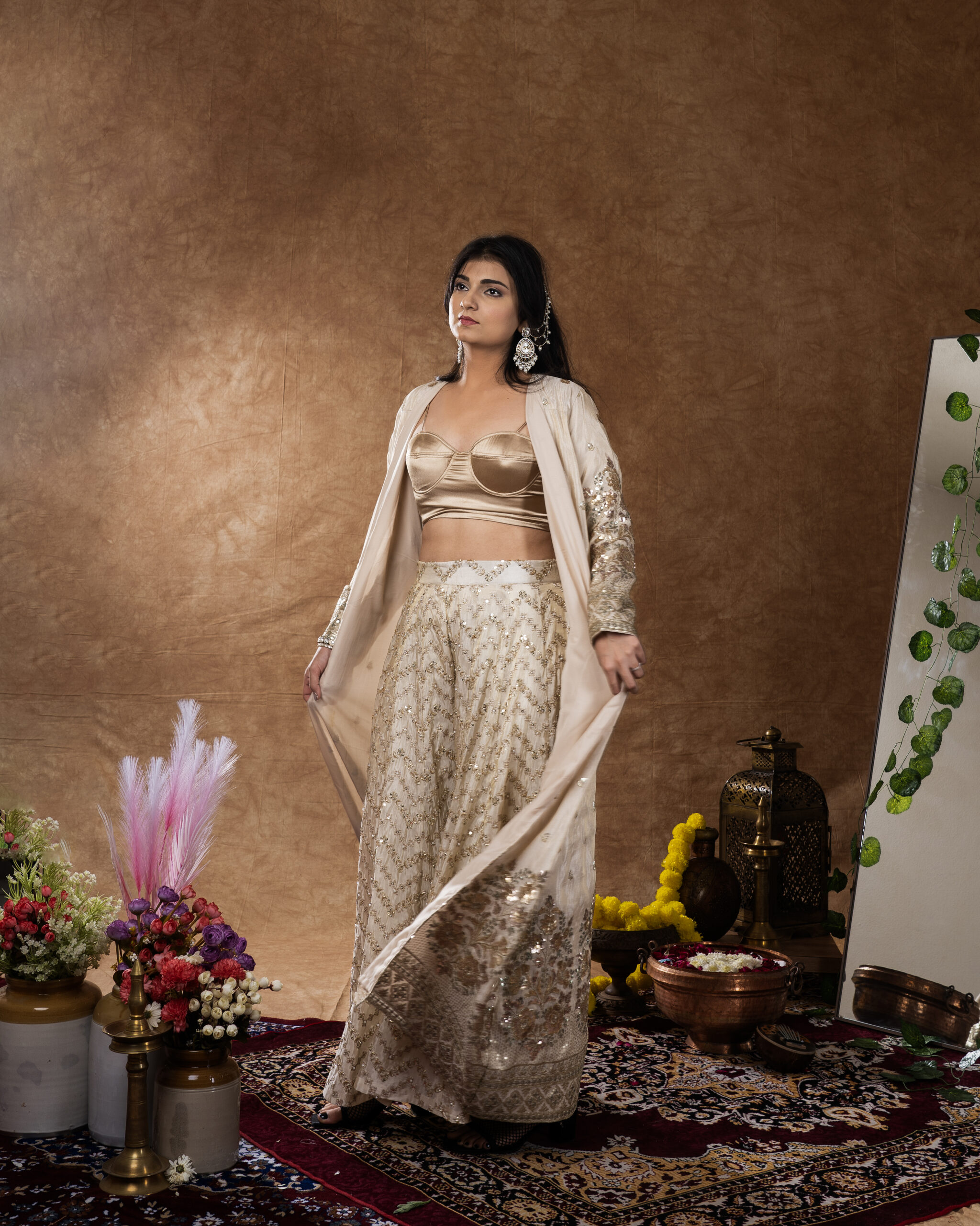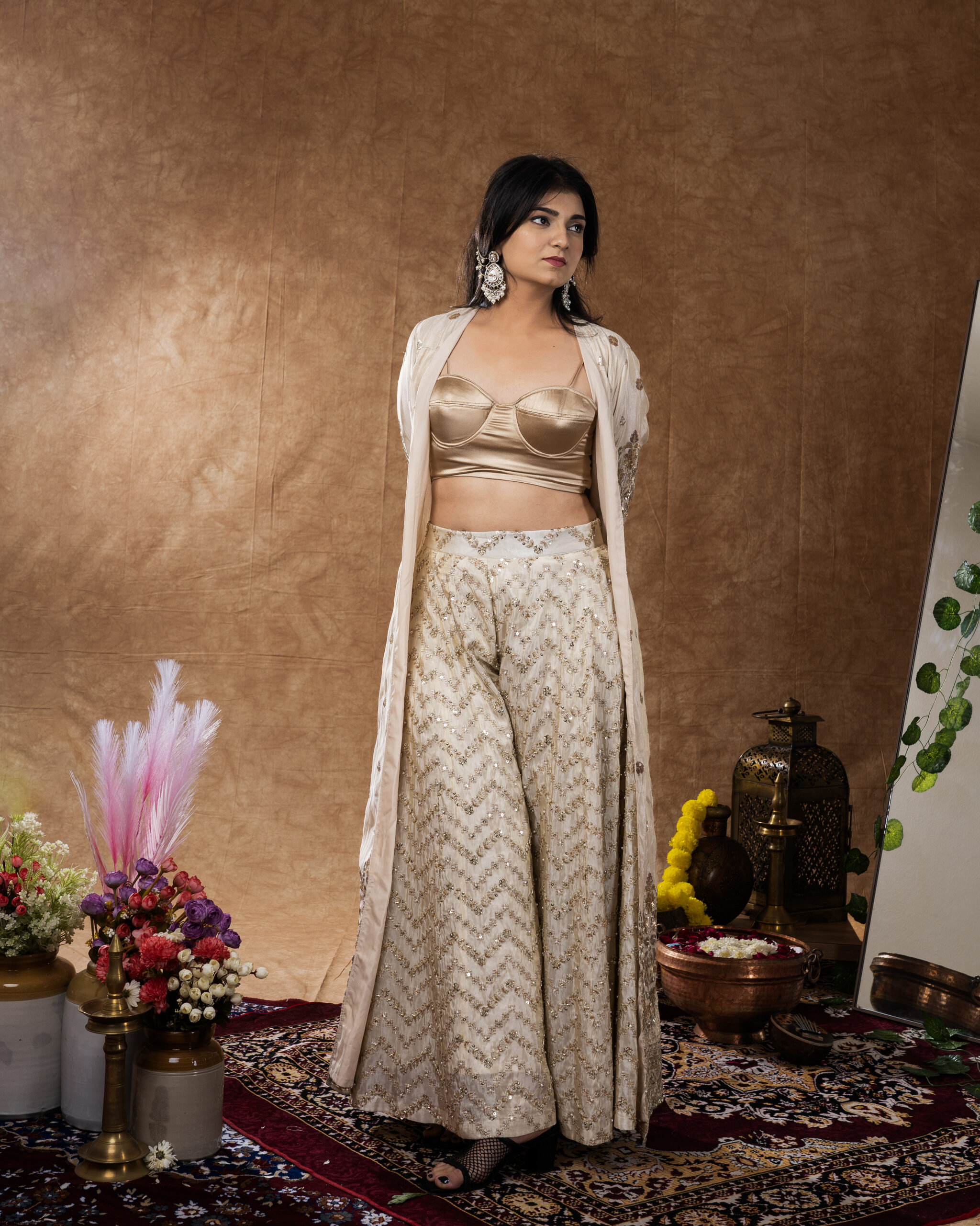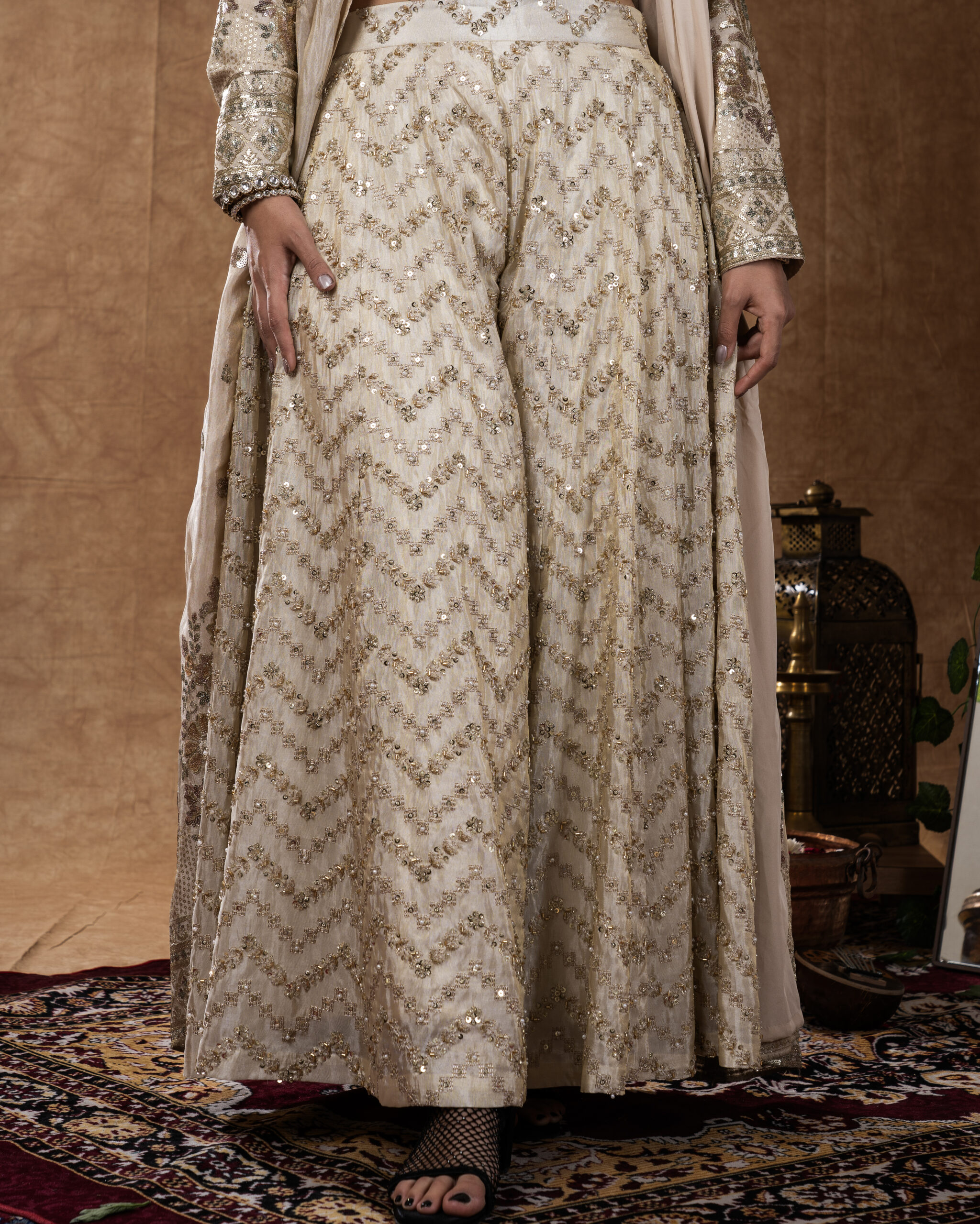 THIS ELEGANT BEIGE SHRUG PAIRED WITH AN EMBROIDERED SHARARA OFFERS A PERFECT BLEND OF GRACE AND MODERN STYLE.