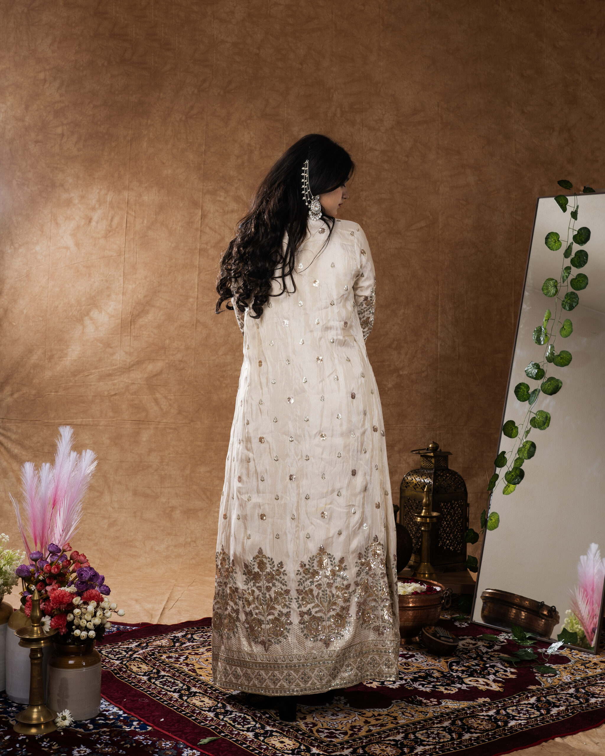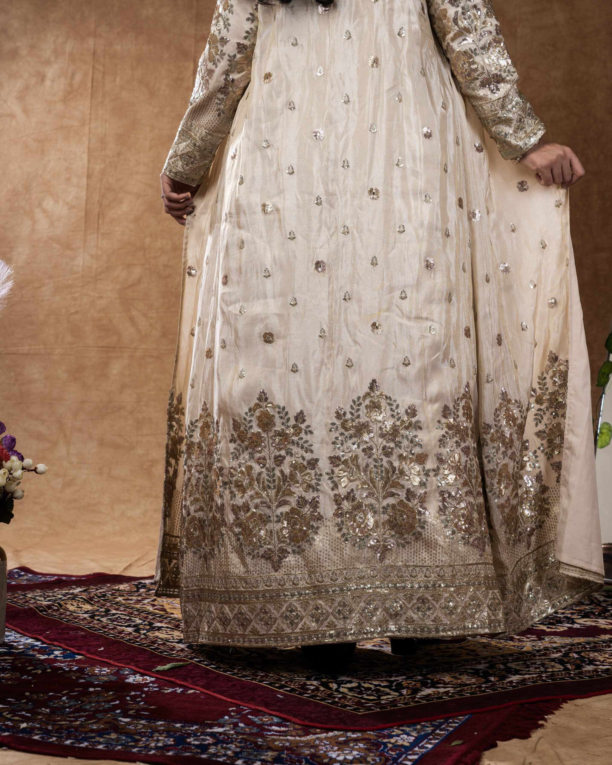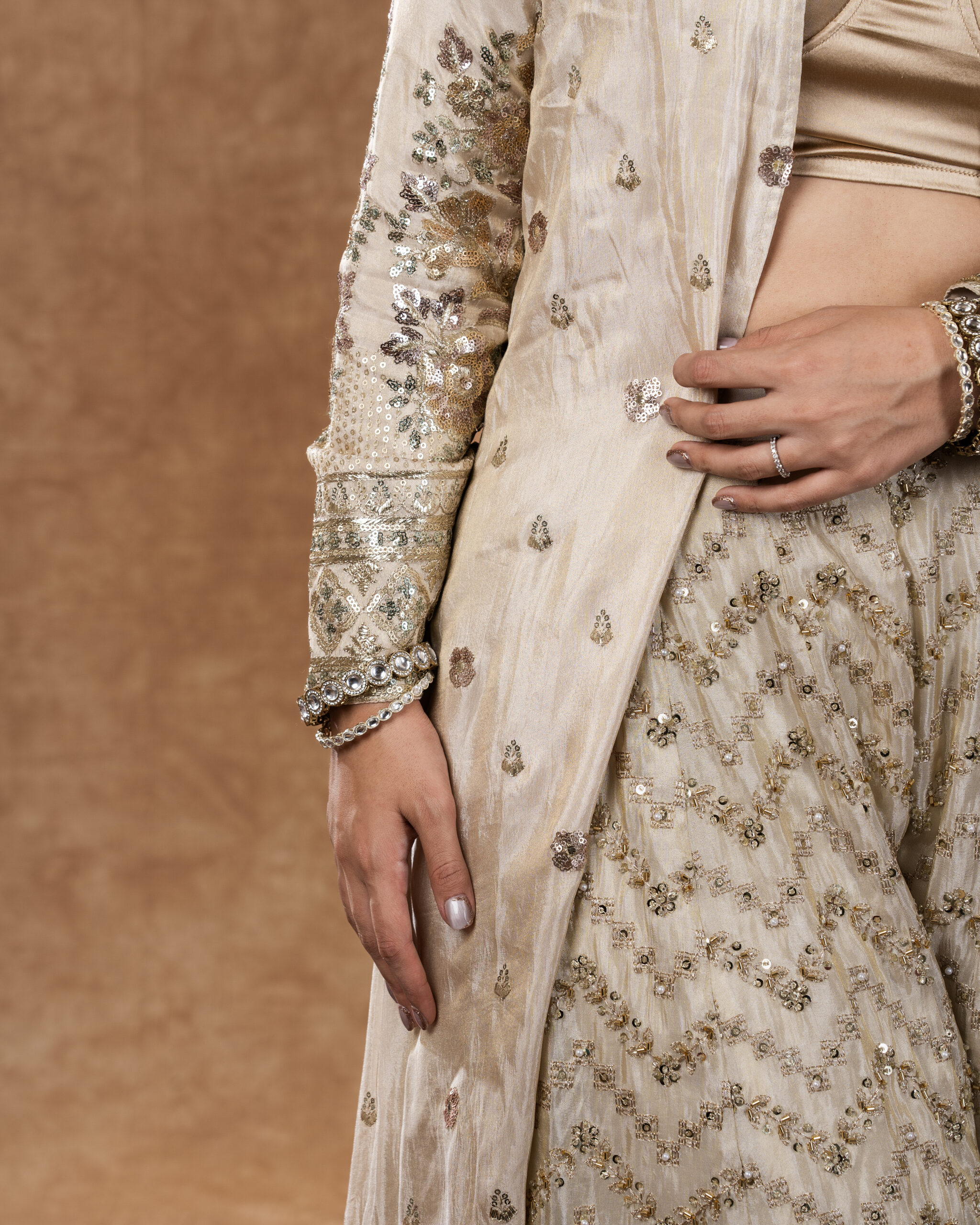 THIS ELEGANT BEIGE SHRUG PAIRED WITH AN EMBROIDERED SHARARA OFFERS A PERFECT BLEND OF GRACE AND MODERN STYLE.