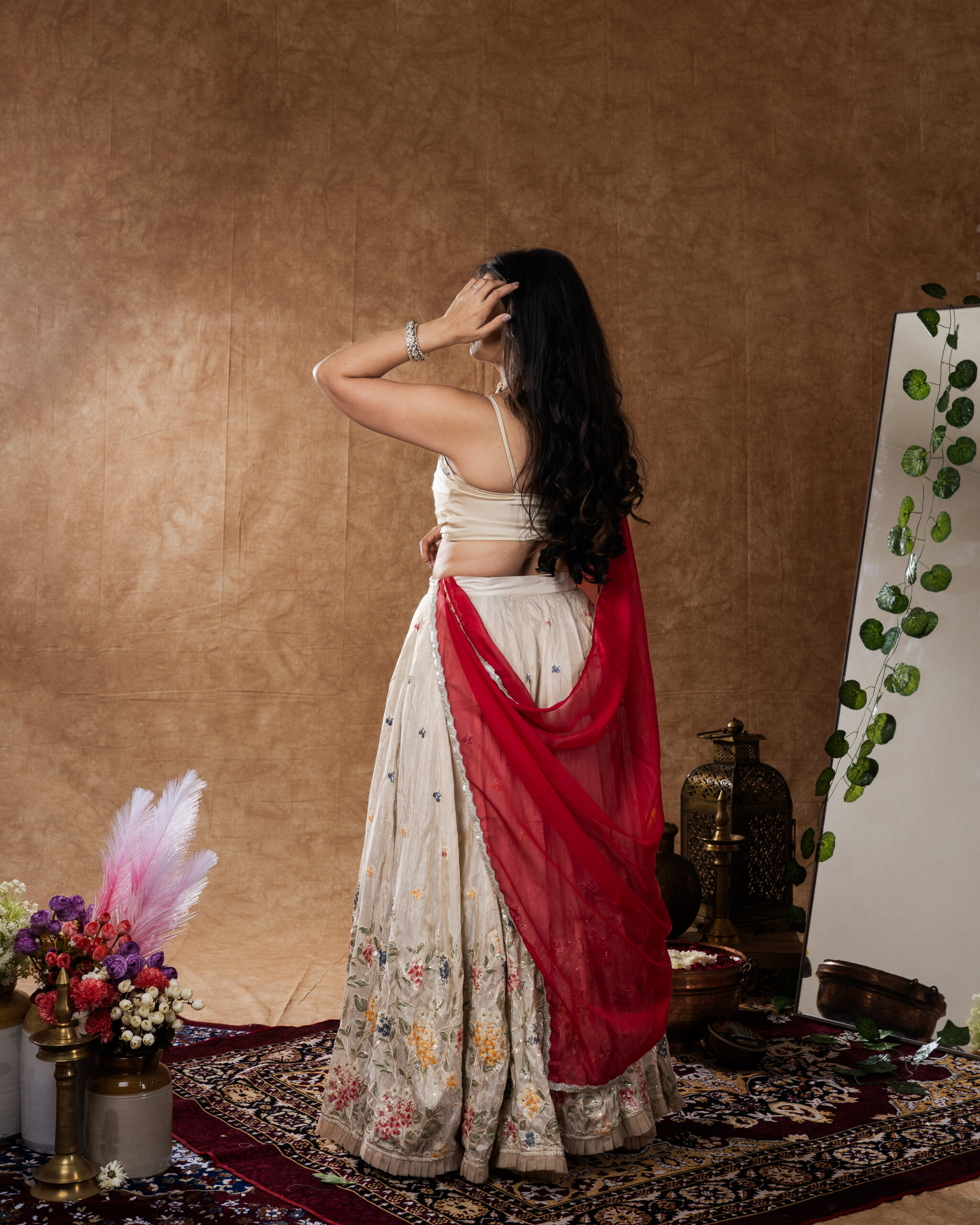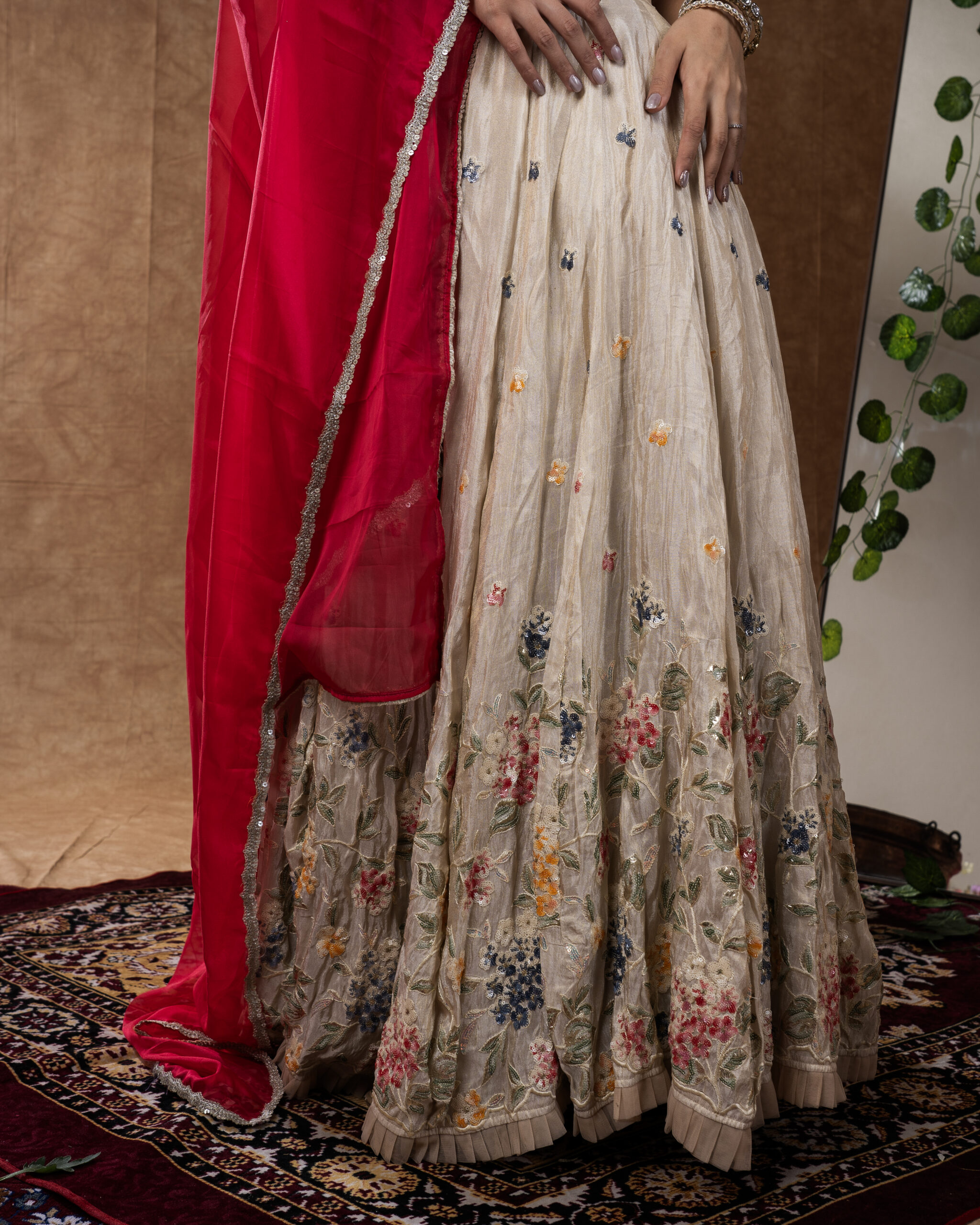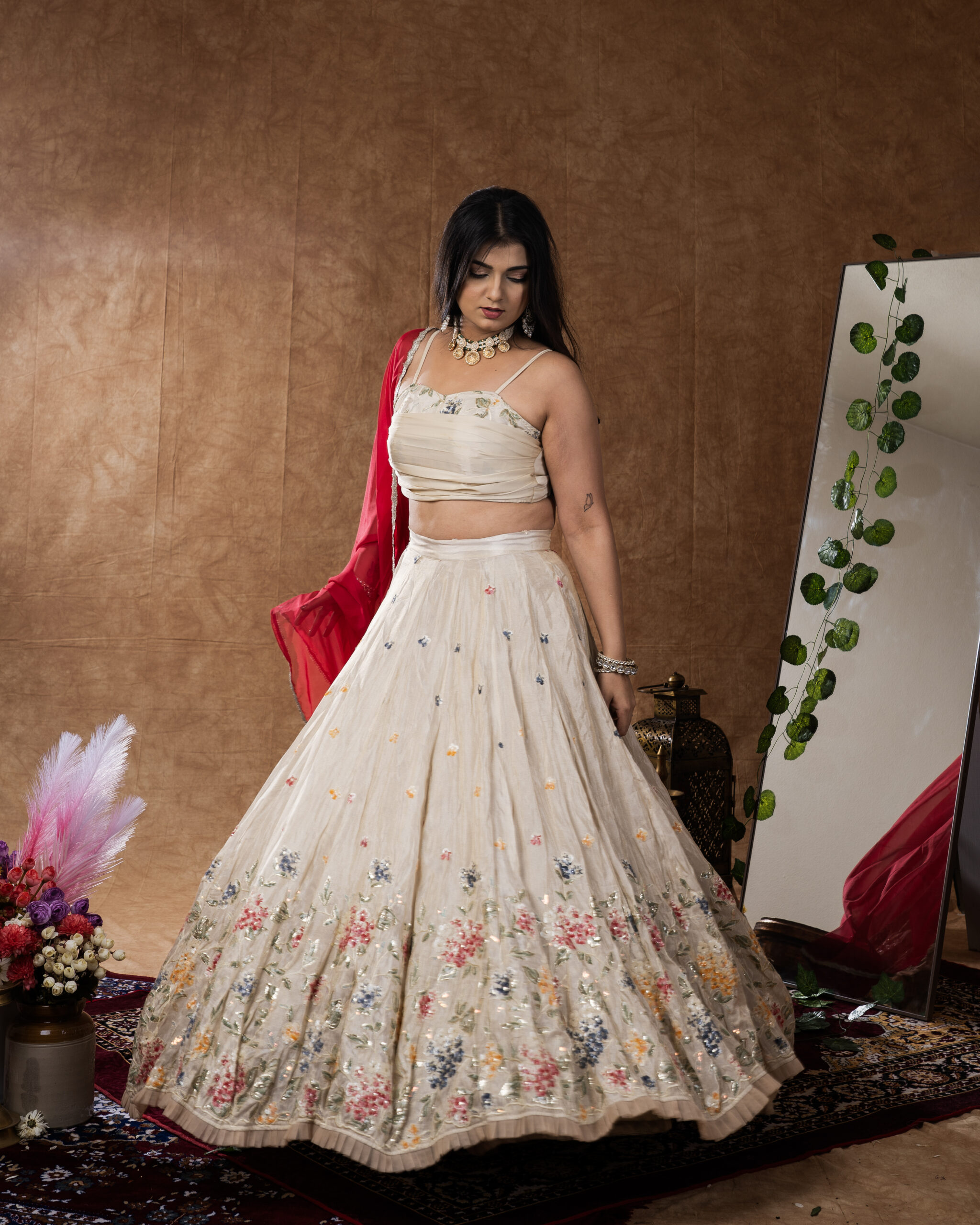THIS ENCHANTING MULTI-COLOR FLORAL EMBROIDERY LEHENGA FEATURES VIBRANT, INTRICATE FLORAL PATTERNS THAT ADD A FRESH, LIVELY TOUCH TO ANY OCCASION.