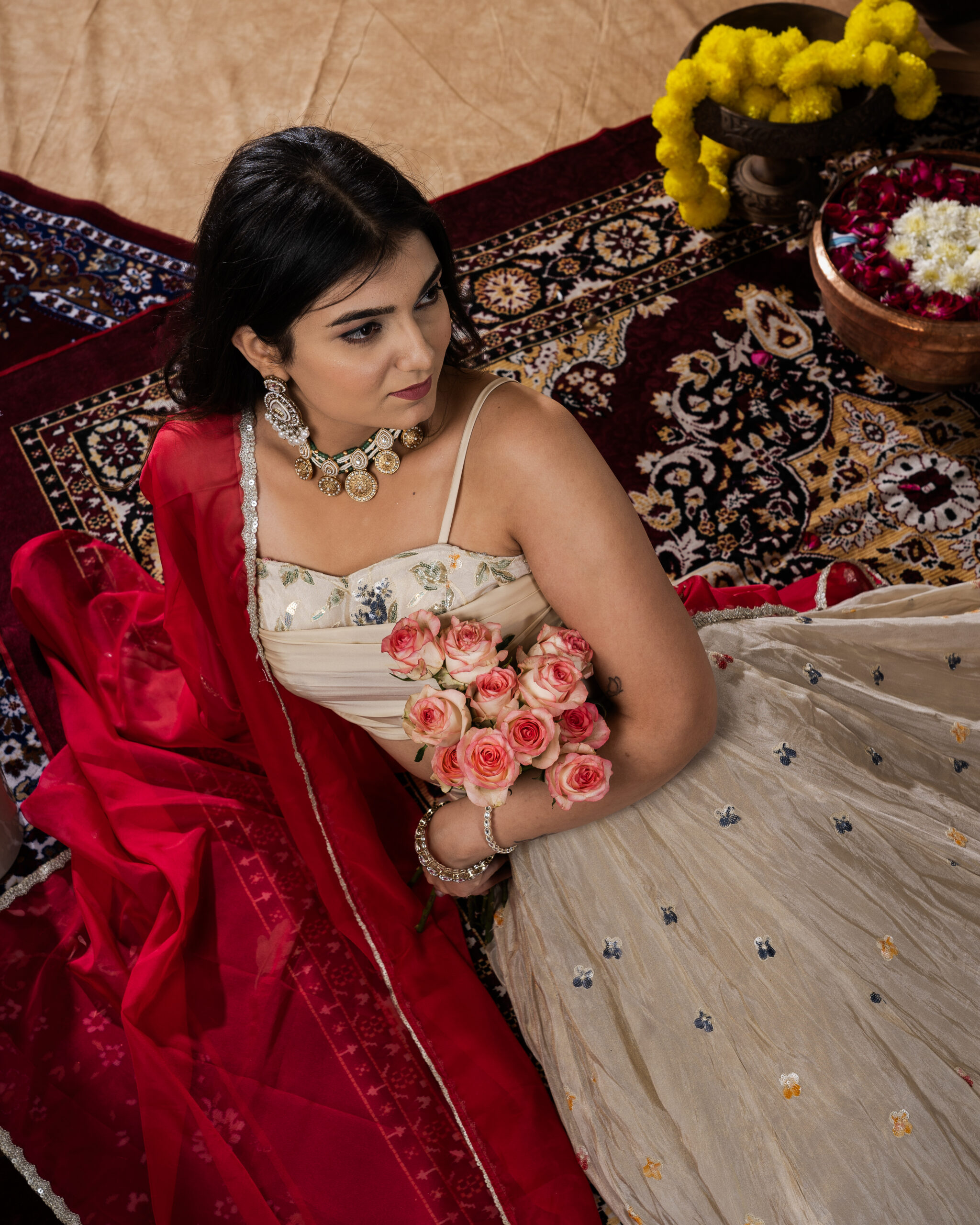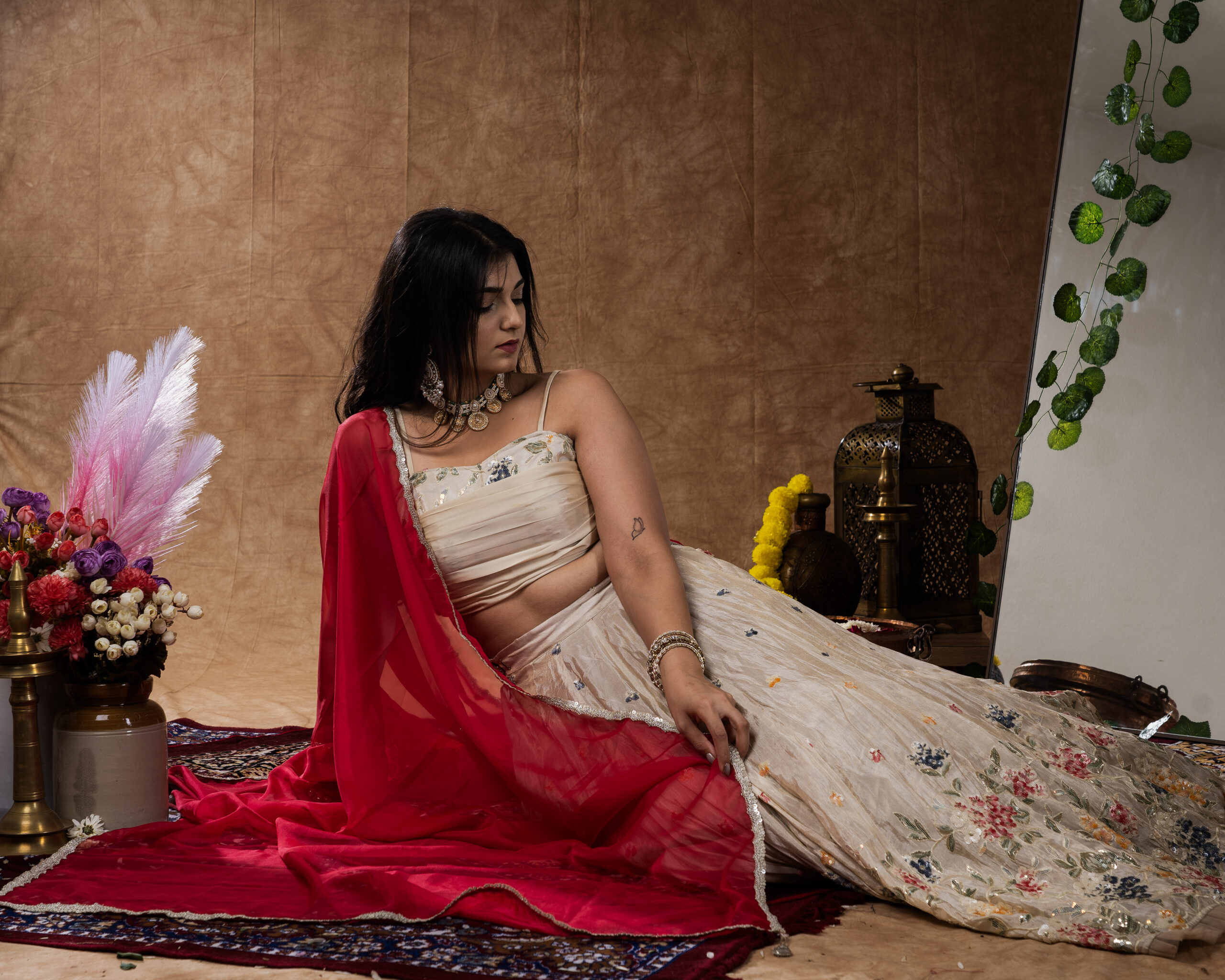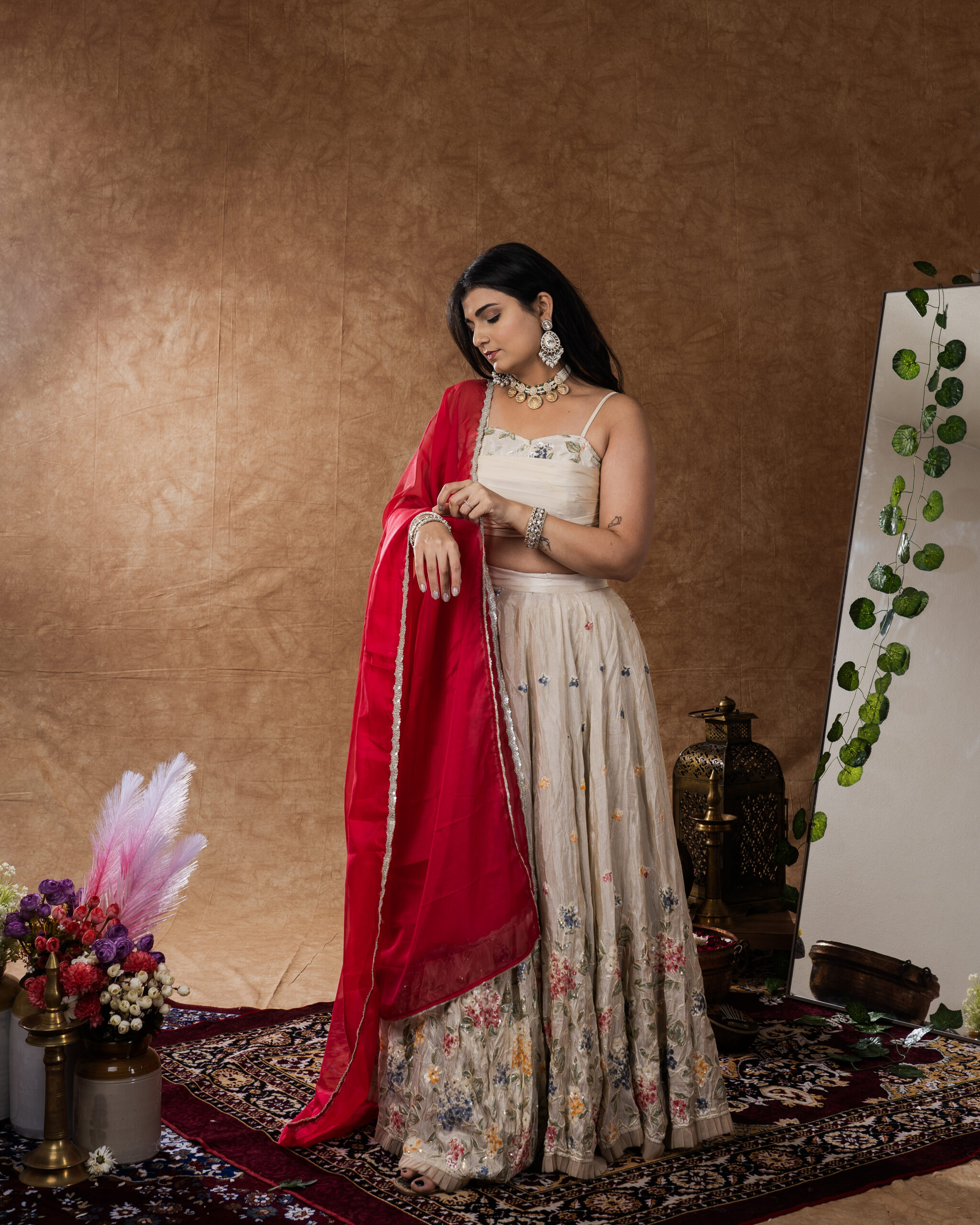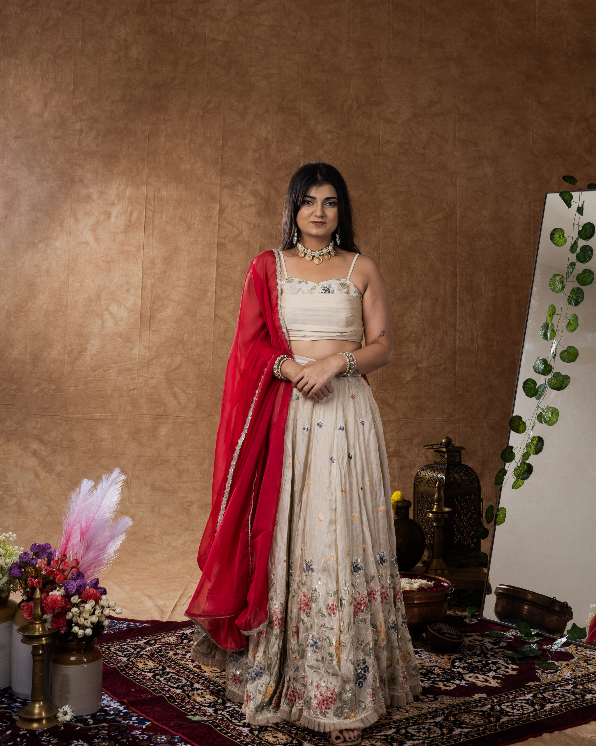 THIS ENCHANTING MULTI-COLOR FLORAL EMBROIDERY LEHENGA FEATURES VIBRANT, INTRICATE FLORAL PATTERNS THAT ADD A FRESH, LIVELY TOUCH TO ANY OCCASION.