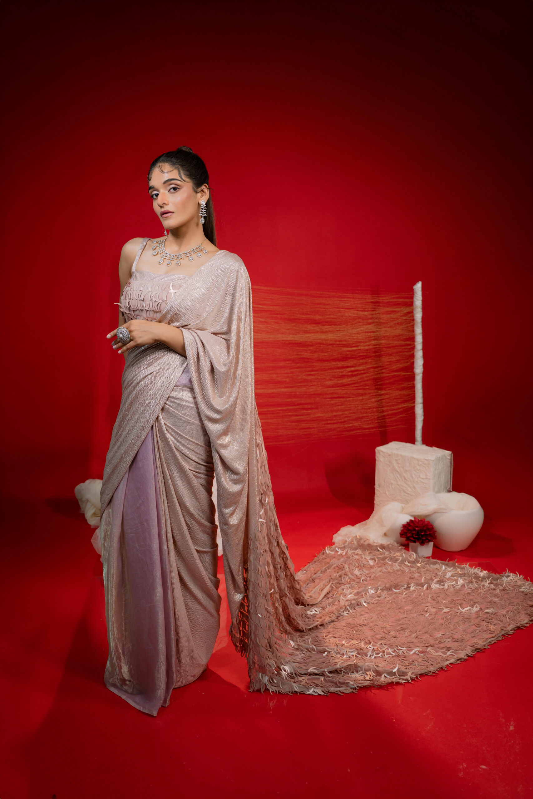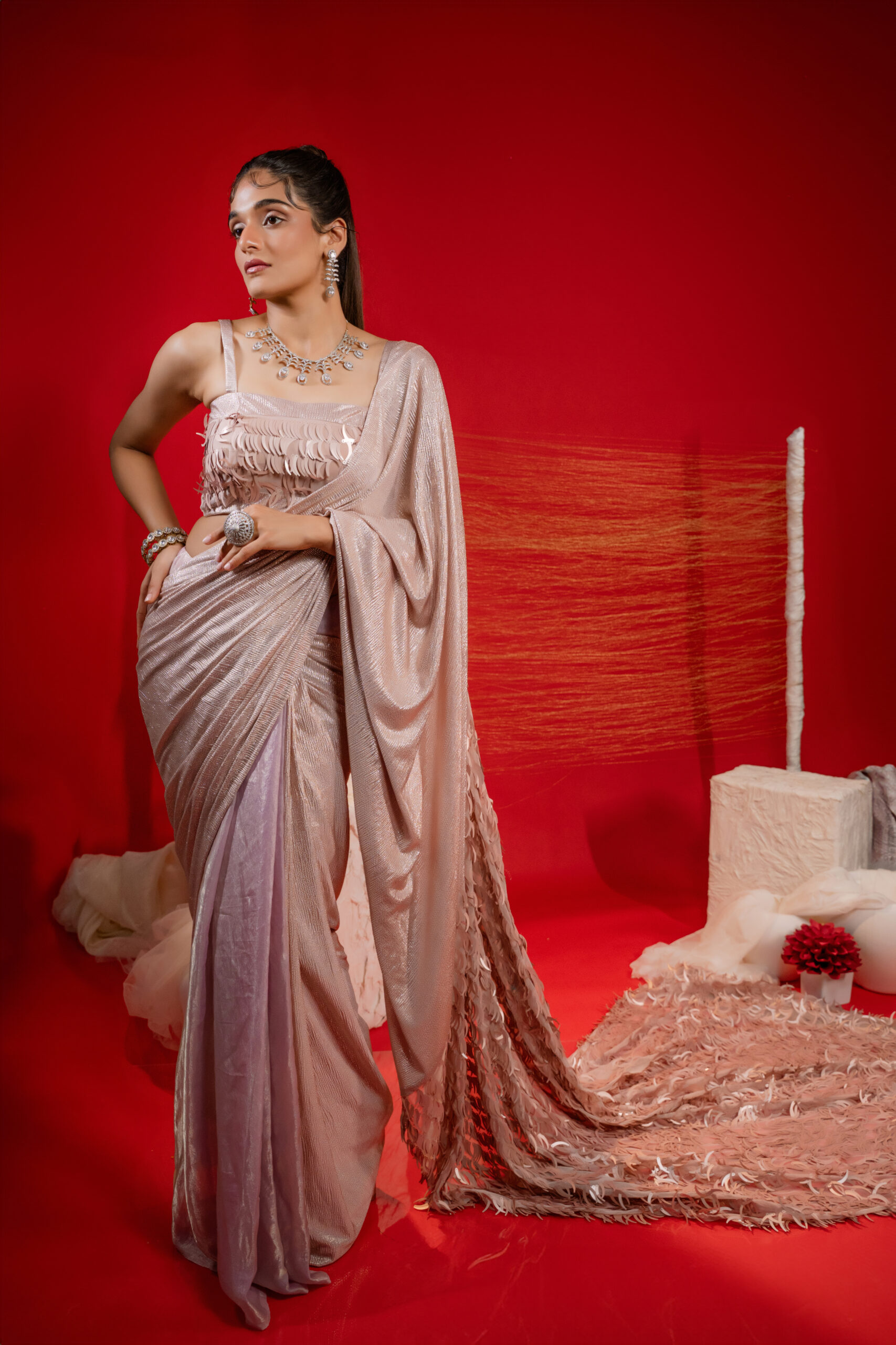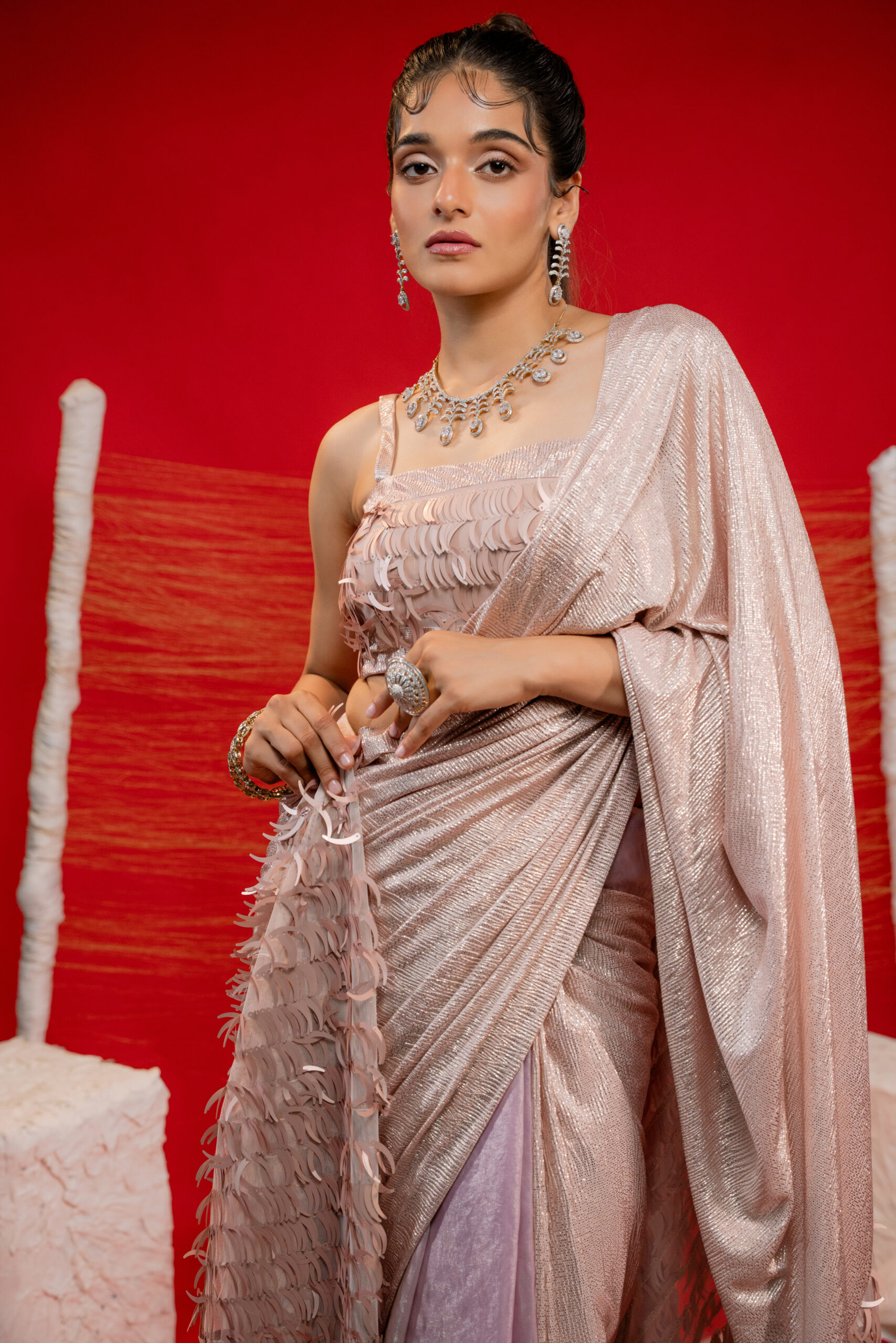 ELEGANTLY CRAFTED USING TISSUE, SHIMMER, AND EMBROIDERED FABRICS, THIS SAREE BLENDS TEXTURES BEAUTIFULLY FOR A LUXURIOUS AND MODERN FESTIVE LOOK.