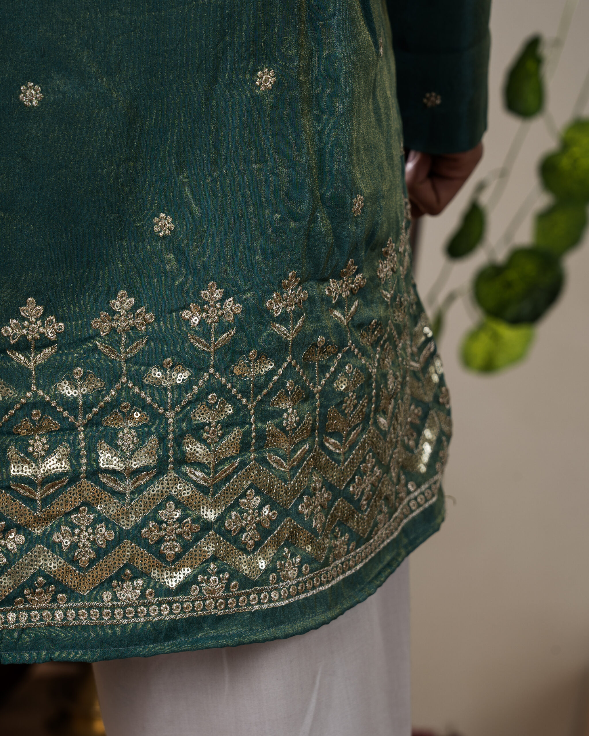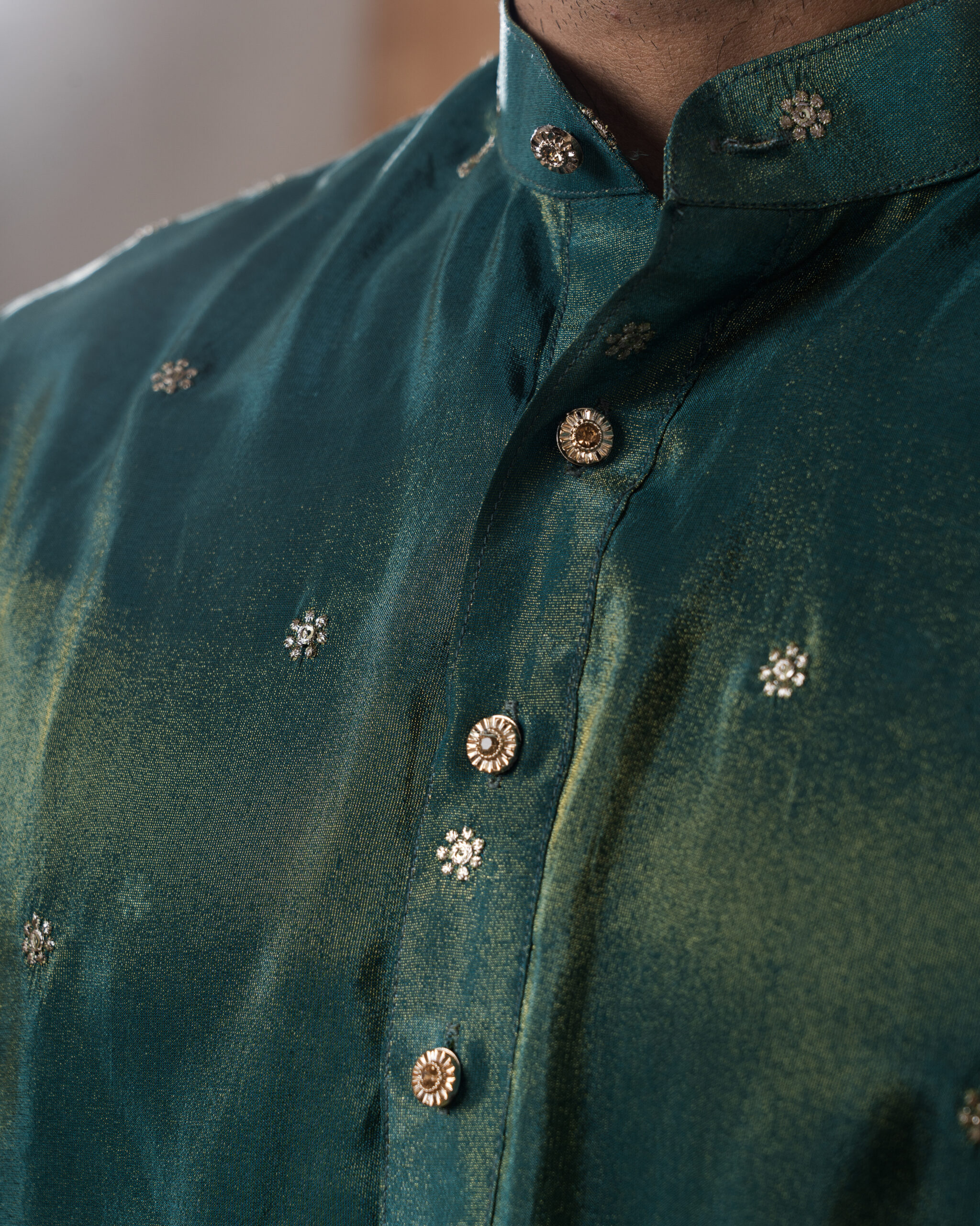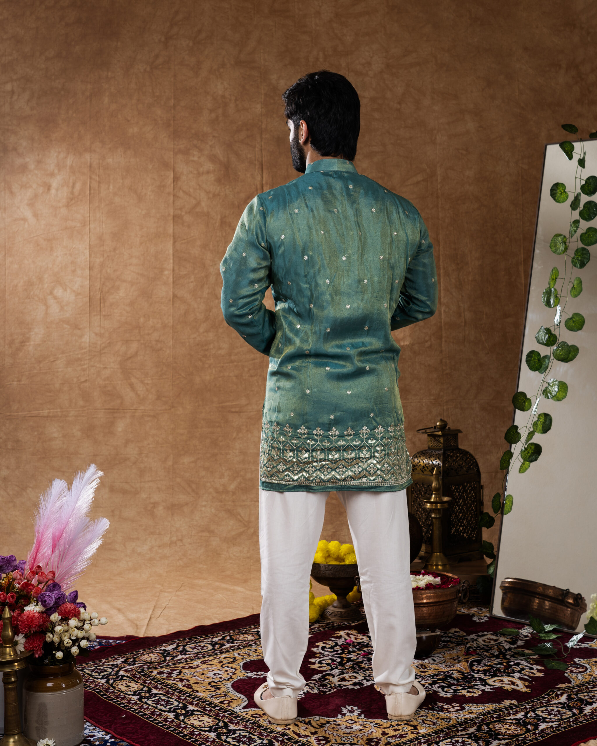 THIS ELEGANT TEAL BLUE MEN’S KURTA, WITH INTRICATE EMBROIDERY, OFFERS A STYLISH BLEND OF TRADITION AND MODERNITY.