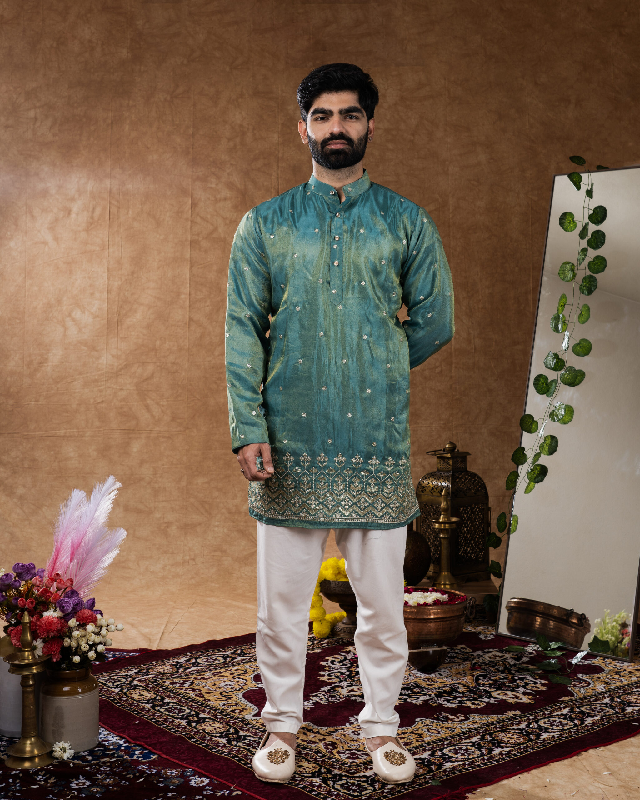 THIS ELEGANT TEAL BLUE MEN'S KURTA, WITH INTRICATE EMBROIDERY, OFFERS A STYLISH BLEND OF TRADITION AND MODERNITY.
